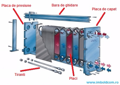 Schimatorul de caldura consta dintr-un pachet de placi metalice pentru trecerea celor doua fluide intre care va avea loc transferul de caldura. Pachetul de placi este asamblat intre o placa fixa si una mobila si comprimate prin strangerea suruburilor. Placile sunt prevazute cu o garnitura care inchide canalul si directioneaza fluidele in canalele alternative.