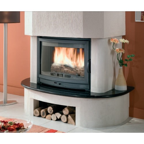 Focar fontă cu geam curb pentru o mai buna vedere a focului.
