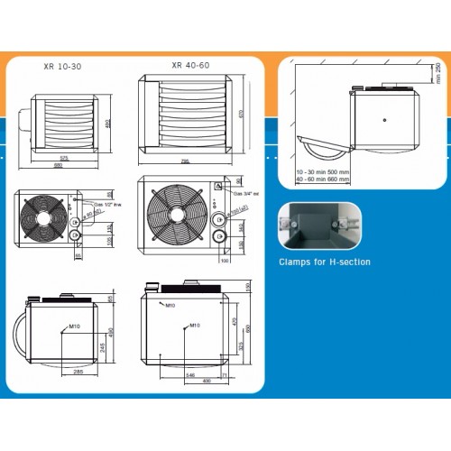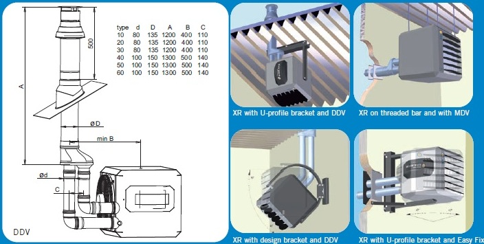 -modelele XR 40-60 au patru puncte de incastrare in colt pentru bara filetata M10. Aceasta permite aerotermei sa fie supendata in pozitia dorita