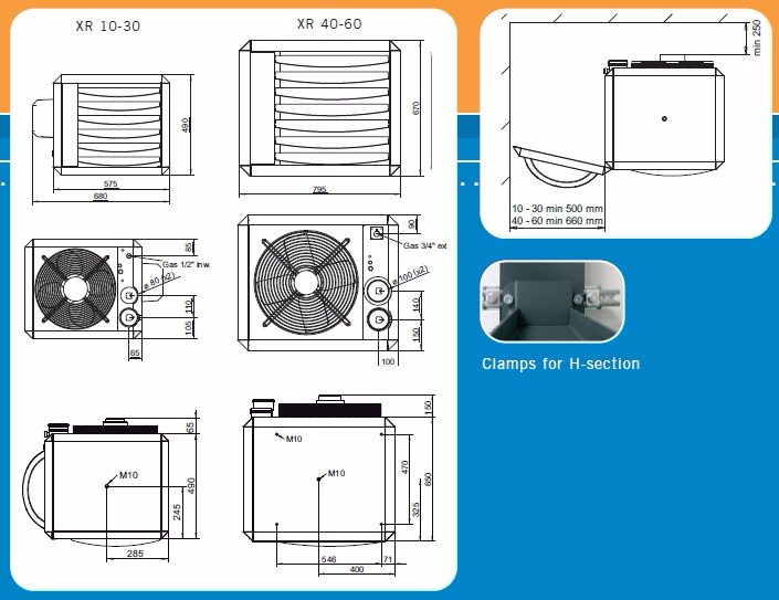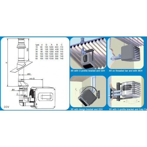 -modelele XR 40-60 au patru puncte de incastrare in colt pentru bara filetata M10. Aceasta permite aerotermei sa fie supendata in pozitia dorita