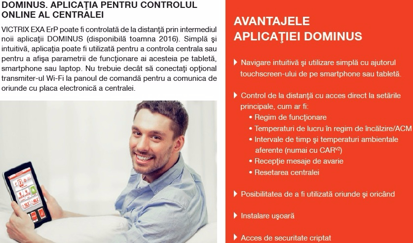 VICTRIX TERA poate fi controlata de la distanta prin intermediulnoii aplicatii DOMINUS. Simpla si intuitiva, aplicatia permite controlul centralei si vizualizarea parametrilor de functionare pe tableta, smartphone sau laptop.